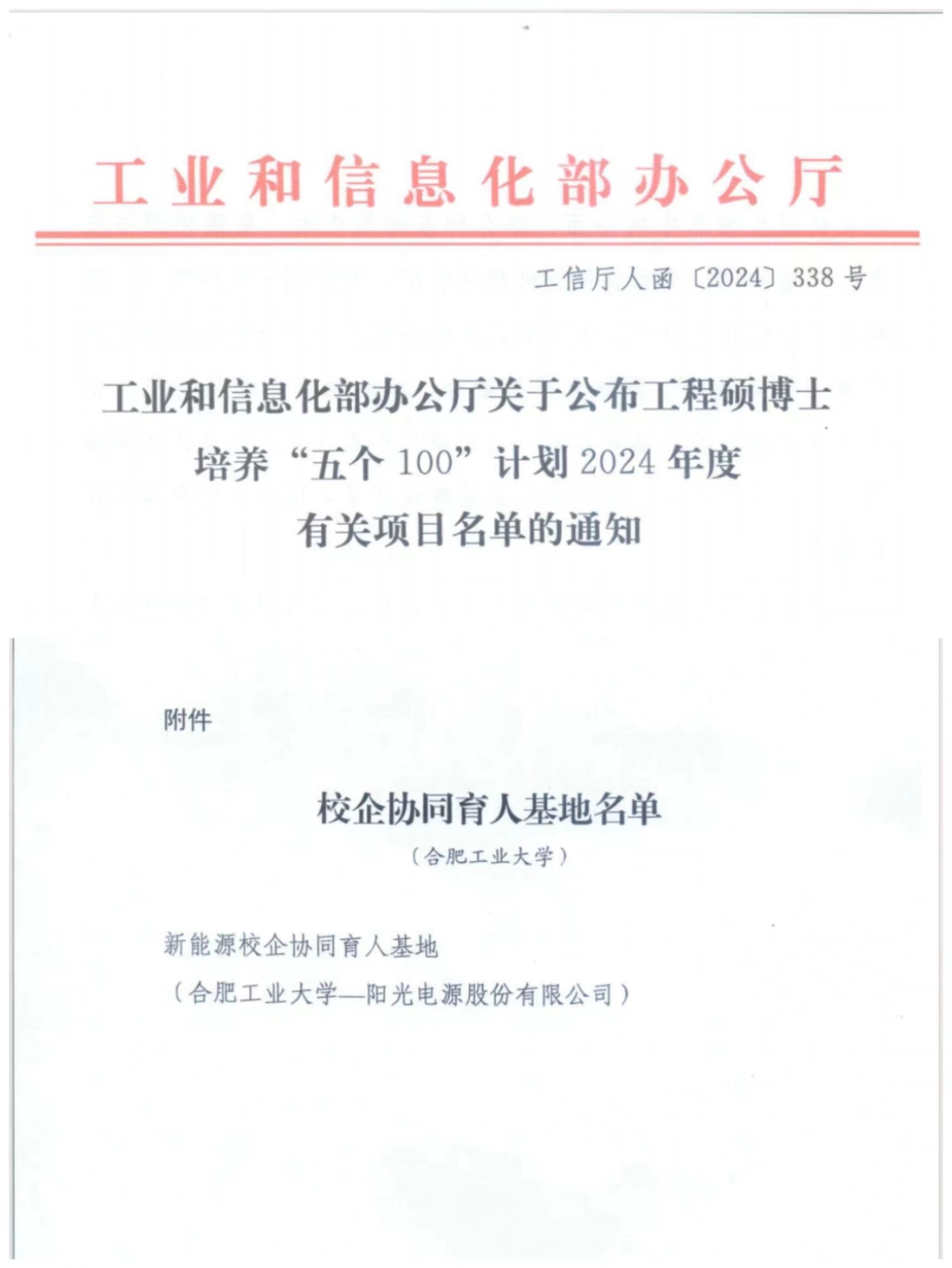 近日,工业和信息化部公布了工程硕博士培养“五个100”计划2024年度有关项目名单,公司与阳光电源股份有限公司共建的“新能源校企协同育人基地”入选校企协同育人基地。